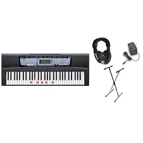 This review is from: Yamaha EZ-200 61 Full-Sized Touch Sensitive Lighted Keyboard Bundle: Includes Professional Headphones, Keyboard Stand, and Power SupplyI read many reviews of this keyboard before I purchased it, both good and bad, and I agree with a number of the comments others have made -- I love the keyboard, hate the stand. First, I love this keyboard and the teaching system. I have found the multiple teaching methods to be very handy and clever. You have the option of learning by following along with a demonstration while the keys light up, or you can just sit and watch and learn, or you can practice tapping out the rhythm on any key just to get the pacing right, or you can use the "wait" method, where the keys light up and the song plays along with you, but if you stop or get the wrong key, the system waits for you, holds the song at that point, lights up the correct key(s) to hit, and does not proceed until you get it right, then continues. I like that you can turn off the demonstration at any point, and you can turn off the lighted keys if you like and just play the instrument like a regular piano.You can also learn by following the diagram of the two hands in a window just above the keys, which shows which fingers on both hands are used to play each note. If you are a slower learner and prefer to learn one hand at a time, you can program the instruction to mute the left or right hand so you can concentrate on just one.You can also learn by looking at the staves that picture each note and where it appears on the lines or spaces, which is great if you do not read music yet and have no idea how the black and white piano keys relate to the notes on the page.I love the feature that allows you to set the tempo, and I have learned many a difficult passage by slowing down that particular section, then using the repeat feature to automatically run through that part over and over until I tell it to stop, then returning to the next section, at either the normal tempo or continuing in a slower tempo. I love the feature that allows you to have chords automatically accompany you using just one finger of the left hand while you focus on learning the right hand melody, OR, if you want to play the keyboard like a regular piano, you can turn off the auto-accompaniment and play the full chords yourself.There are hundreds of voices and styles and tunes to choose from, and the instruction booklet that comes with the keyboard teaches you how to use all those features. One of the most amazing aspects is how the voice called "Grand Piano" makes your electric keyboard sound like just that -- like having a baby grand in the living room. Or you can make yourself sound like a church organ or violins or brass or woodwinds and on and on. You can add drumbeats and other backgrounds in absolutely any musical style you can think of. A legend printed above the keys offers numerous short-cut suggestions for choosing the style and voice you want. A keypad lets you choose which song you would like to learn, and those numbers correspond to the songs in the songbook that comes with the keyboard, and these songs are programmed into the listen-and-learn built-in songs. My only complain...