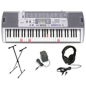 This review is from: Casio LK-100 Lighted Keyboard with Premium Accessories PackageThis is a great package for the price. This is an easy keyboard to learn to play for both children and adults alike. The Casio Key Lighting Keyboard LK-100 is as fun as it is practical. It's an ideal learning tool for young pianists and a fun way to experience music.The keyboard has 61 full-size keys. We love the keys' optional light-up function, and we enjoyed being able to immediately "play" the keyboard. The lighted keys help beginners become familiar with the timing of the notes that follow one of the 100 built-in tunes from the keyboard's song bank. A songbook (included) allows kids and adults to view the printed musical notes for each song. The tempo of the songs can be slowed as you learn to follow the keys, which is a nice feature. The key lighting feature can be turned off as desired. This is particularly important for advanced players who wish to use the instrument as a traditional keyboard.We like the Casio Key Lighting Keyboard's high-tech look. A large LCD screen indicates function and song title. There is a tempo control, a volume slider, rhythm buttons and other controls. The Casio Key Lighting Keyboard's song bank is a fun feature. The keyboard has 100 popular songs stored and they can be heard at the push of a button. Songs include holiday favorites like Jingle Bells, as well as a peppy rendition of Happy Birthday to You and a variety of classical songs. Younger kids will be thrilled to hear a theme song from the Finding Nemo movie.This feature-rich keyboard includes 50 built-in auto-accompaniment patterns (kids will feel like rock stars!). Additionally, users can choose a chord and the keyboard will automatically produce a matching bass, chord and rhythm. Advanced players will find it easy to change keys, and a microphone jack makes it a breeze to sing along with tunes. The premium package with the Casio LK100 is a great buy for the money.The Casio Key Lighting Keyboard has plenty of bells and whistles to immediately attract children and adults. It's fun. It lights up. It plays music. The best part, however, is that the attraction doesn't end there. This is a well-built musical instrument on which children and adults can really learn to play music.Only negative thing is that it does have MIDI but in order to use this feature, you will need to couple it with a PC to use, since it doesn't have a built-in disk drive....